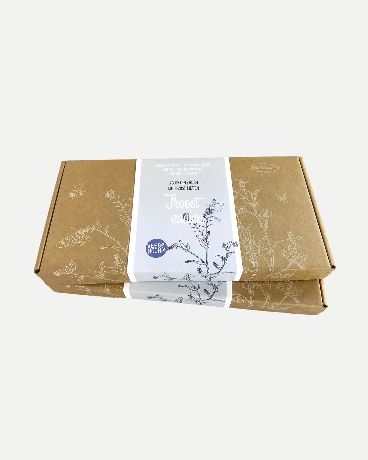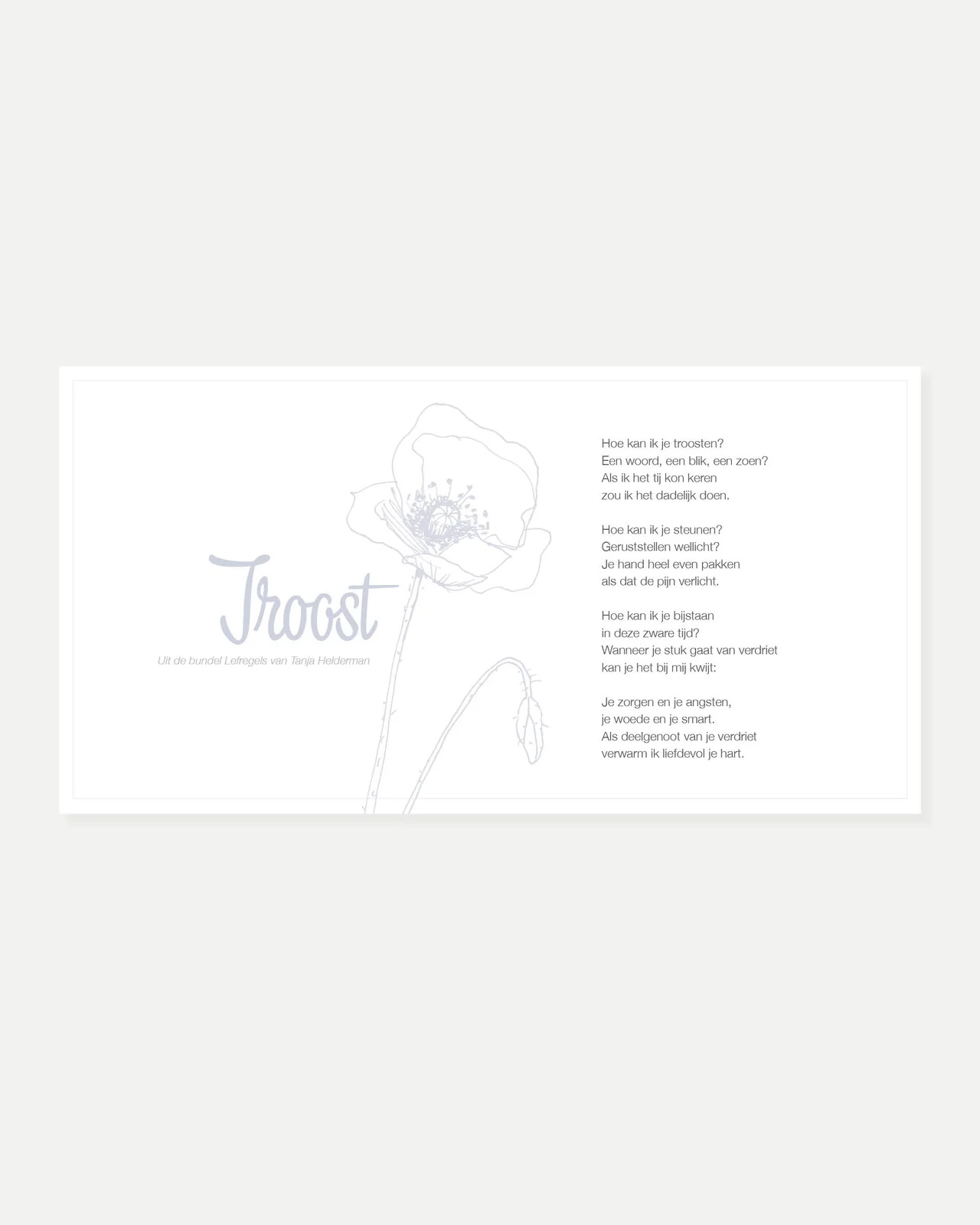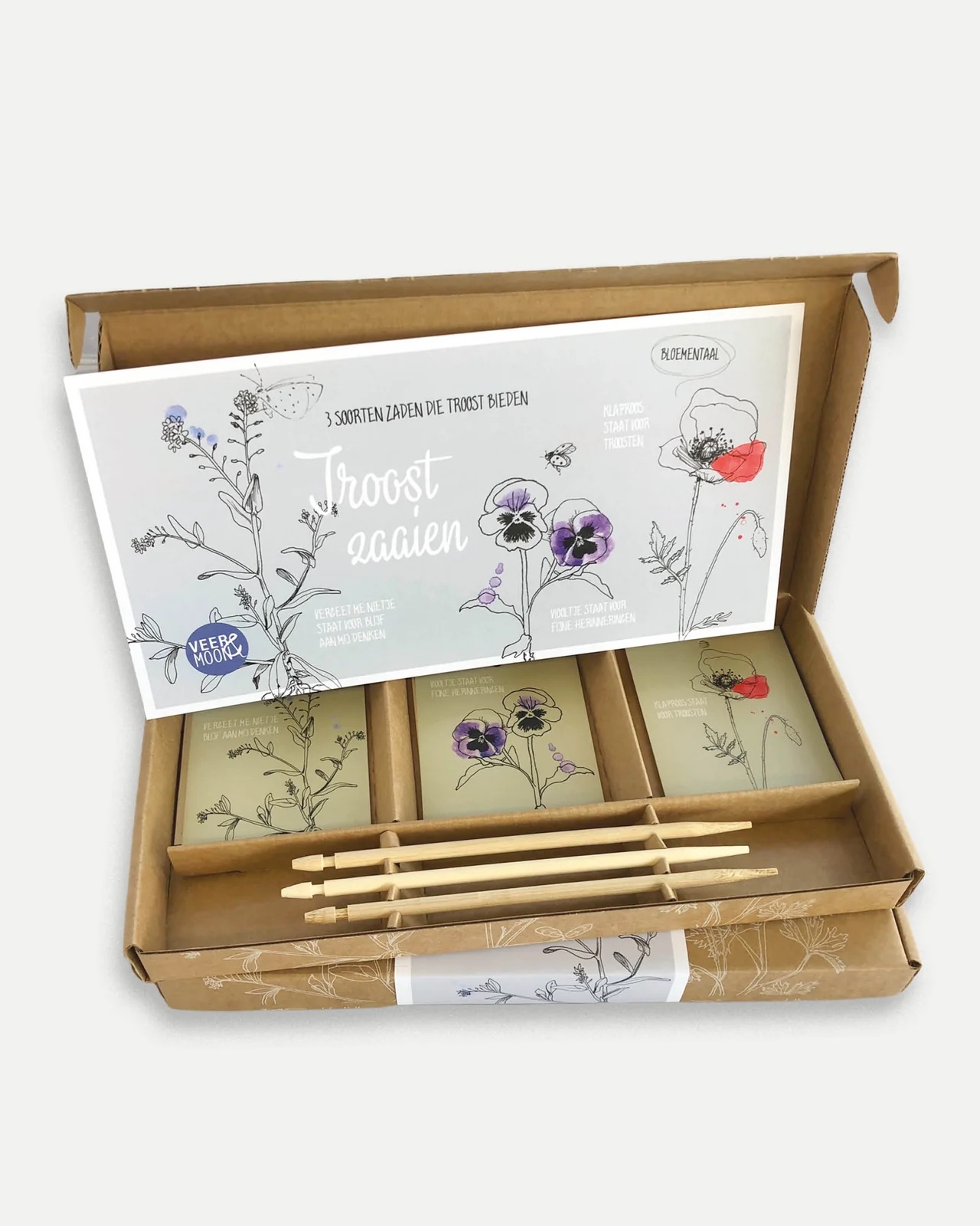 Cadeaudoosje Troost zaaien met drie soorten zaden die troost bieden: Vergeet me nietje (staat voor 'blijf aan mij denken'), Viooltje (staat voor fijne herinneringen) en Klaproos (staat voor troosten). Daarbij drie labels met stokjes om bij het potje of in de grond te steken. Op de kaart staat op achterzijde een mooi gedicht van Tanja Helderman uit de bundel Lefregels